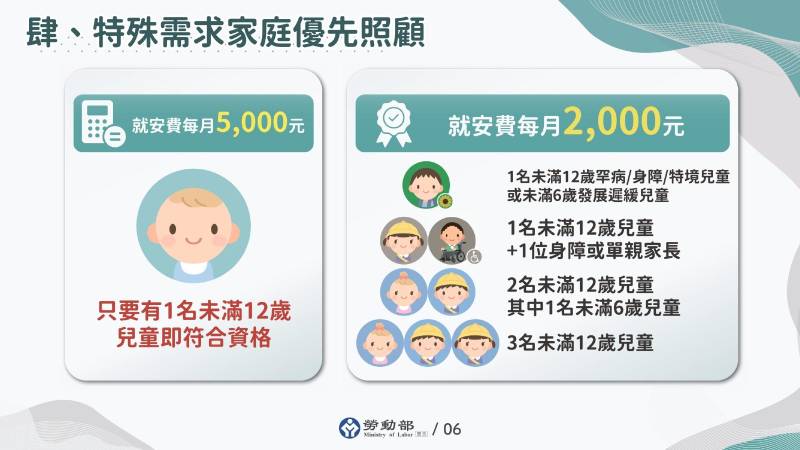 新制特別強調「弱勢優先」原則,以下家庭類型除符合基本申請資格外,還可享有優先行政審查權(專責單位受理)及差別費率(就安費減免)的照顧: